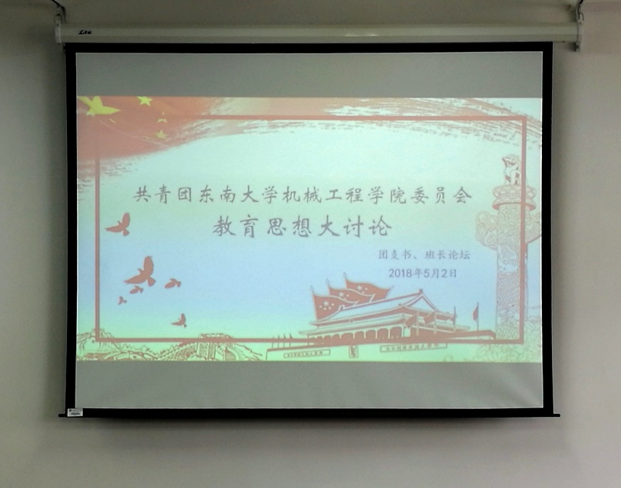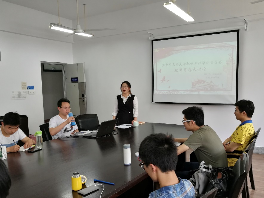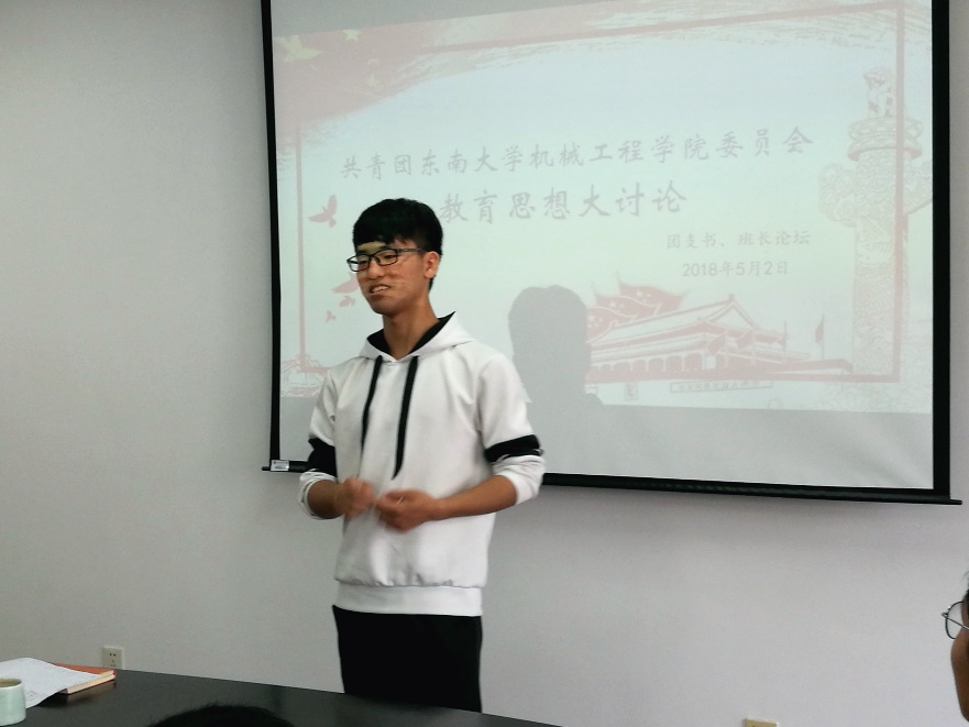 最后获得国旗团支部提名奖的团支书戴松乔分享了所在团支部组织建设经验及获得国旗团支部提名奖幕后的故事。经过此次讨论,在座的学生干部对在东大双一流建设的大背景下如何带领所在基层组织开展工作认真思考,并有了新的体悟。相信在新时代的背景下,机械学院的基层组织学生干部可以配合学校积极开展工作,为推进学校双一流建设的工作提供创意和色彩。