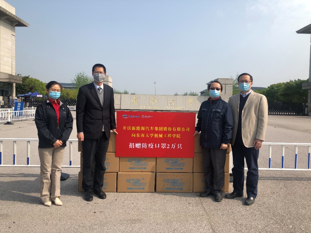 4月21日上午,开沃新能源汽车集团股份有限公司在东南大学九龙湖校区举行捐赠交接仪式,向KY在线官网捐赠2万只口罩,用于学院师生返校后校园内的个人卫生防护,助力学校开学复学。开沃新能源汽车集团股份有限公司人力资源部总监乔达、人力资源部业务经理杨艳丽和KY在线官网党委书记张志胜教授、机械工程学院副院长殷国栋教授作为双方代表参加了交接仪式。