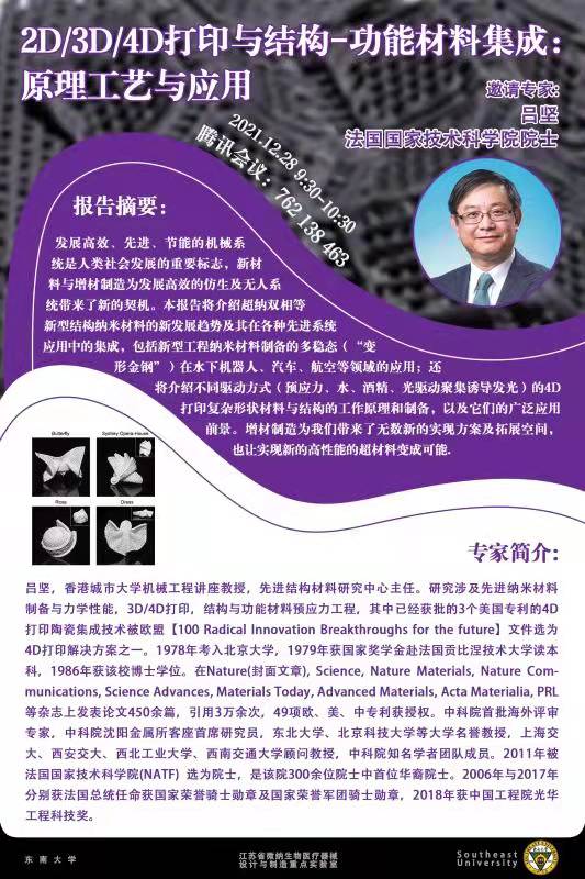 院士报告|法国国家技术科学院吕坚院士 2D/3D/4D打印与结构-功能材料集成:原理工艺与应用