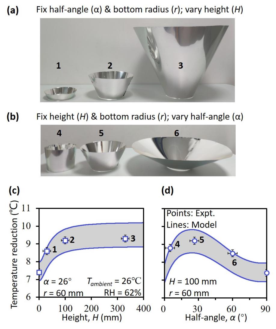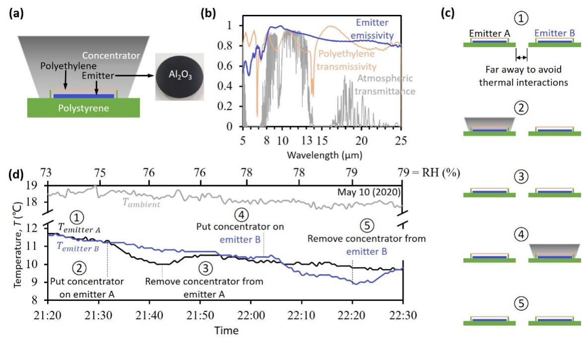 3:(a-b)根据理论优化的辐射制冷“汇聚器”(c-d)实验结果与理论模型对比。