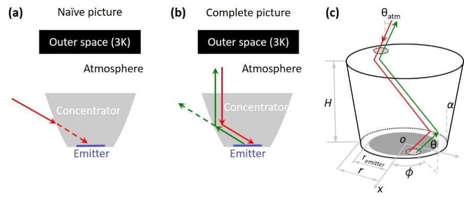 1:(a)错误的“辐射制冷汇聚”物理图像:忽略了“吸收-辐射互易性”(b)完整的物理图像(c)“射线追踪”法优化辐射制冷汇聚效果。