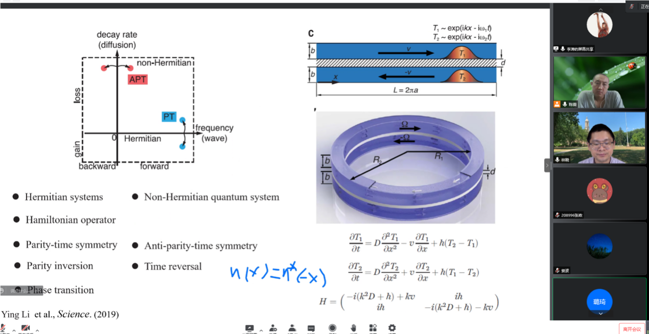 202263日,由东南大学机械学院联合发起的传热学-光子学-拓扑学第一次圆桌讨论会圆满结束。 来自美国宾州州立大学(Pennsylvania State University)机械系的朱林晓教授,上海交通大学物理与天文学院的袁璐琦教授,和东南大学机械学院的陈震教授参与了讨论。三位教授就各自的研究领域进行了深入的探讨,将光子学、拓扑学、传热学进行了揉合。理论物理学出身的袁璐琦教授从基础物理的层面,对近期的热点科学研究“从量子力学的对称性重新审视传热现象”进行了深入浅出的讲解,打破了行业间“隔行如隔山”的壁垒,令参与讨论的其他两位教授和旁听的听众受益匪浅。
