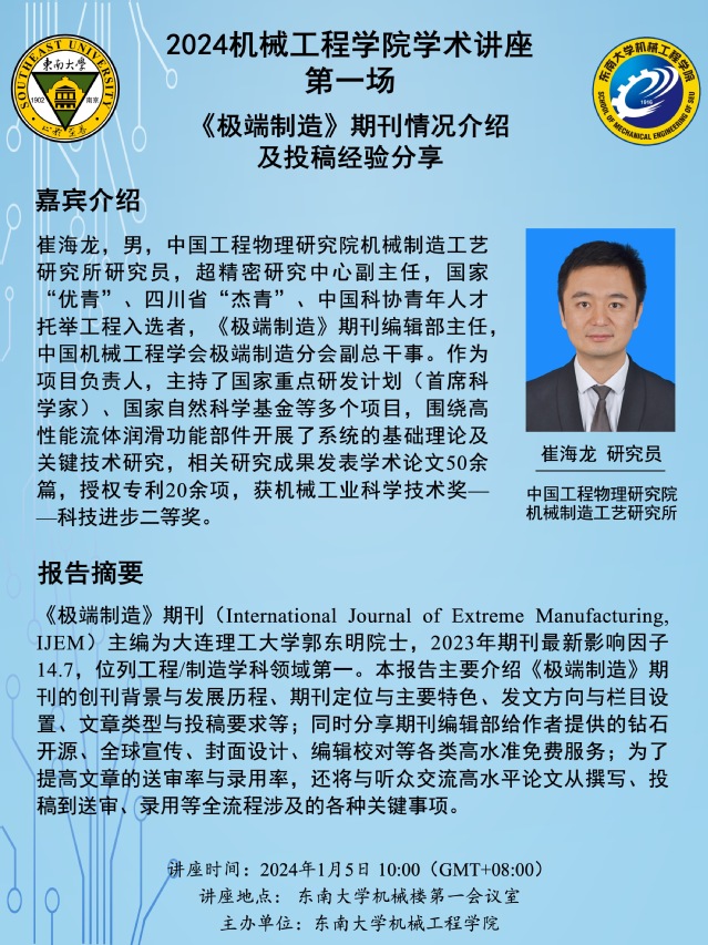 《极端制造》期刊(International Journal of Extreme Manufacturing, IJEM)主编为大连理工大学郭东明院士,2023年期刊最新影响因子14.7,位列工程/制造学科领域第一。本报告主要介绍《极端制造》期刊的创刊背景与发展历程、期刊定位与主要特色、发文方向与栏目设置、文章类型与投稿要求等;同时分享期刊编辑部给作者提供的钻石开源、全球宣传、封面设计、编辑校对等各类高水准免费服务;为了提高文章的送审率与录用率,还将与听众交流高水平论文从撰写、投稿到送审、录用等全流程涉及的各种关键事项。