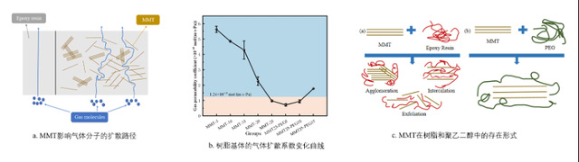 论文通过添加比表面积较高的蒙脱土(MMT)作为阻氢材料,将氢气分子在环氧树脂中的扩散路径延长,降低其气体扩散系数,如图2(a) 所示。但蒙脱土团聚体形式与环氧树脂不相容,这会导致环氧树脂的力学性能大幅下降。因此,进一步添加聚乙二醇(PEG)作为改良剂,以提高树脂的力学性能。