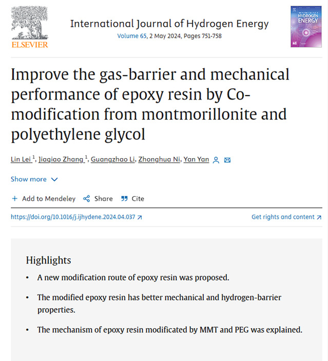 近日,我院2021级本科生雷林通过SRTP项目《面向无内衬储氢气瓶的树脂低温力学与透气性研究》(指导教师:严岩)在全复合材料液氢容器研究方向取得进展,相关研究成果以“Improve the gas-barrier and mechanical performance of epoxy resin by co-modification from montmorillonite and polyethylene glycol”为题发表在氢能领域顶级期刊之一《International Journal of Hydrogen Energy》。该期刊为JCR分区Q1区,最新影响因子为7.2