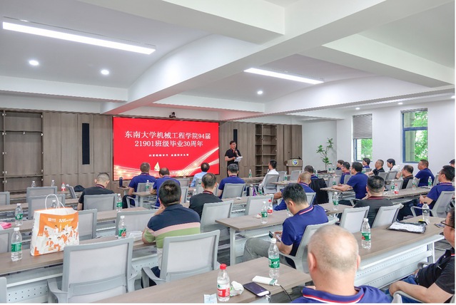 班会上,原校长助理任祖平讲话,他指出东南大学教会学生最好的能力就是自主学习,这一能力使大家能够在毕业后的职场中应对自如。东南大学也在与时俱进,从实验室办学条件、办学理念等各方面都在赶超国际一流水平。他回忆起当年,毕业时赠送给21901班同学的六个字的目标“事业 友谊 爱情”,如今经过三十年回首,均已圆满完成。同时,他也为同学们的未来也提出了新六个字的希冀“健康 家庭 事业”。