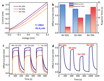 图4 相对湿度对传感器的影响。(a) 不同相对湿度条件下传感器的 I-V 特性。(b) 不同湿度条件下偏移电流和响应时间的变化。 (c) 不同相对湿度条件下的动态氢开关周期响应。 (d) 相对湿度变化时的动态氢响应曲线。