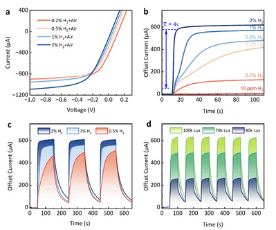 研究人员对传感器的氢响应性能进行了测试。如图2所示,对不同氢气浓度下的I-V曲线进行了表征。可以发现光电流随着浓度的增加而减小,这是由于电偶极子的积累阻碍了光生载流子的运动。在2% H2浓度下,设备的响应时间为4秒。在浓度为10ppm的氢气环境中,可以检测到器件的极端电流响应。为了测试器件的稳定性和可重复性,对器件进行了不同浓度和光强环境切换检测,如图2(c)和(d)所示。不同光强测试的气体切换间隔为50秒,不同浓度测试的气体转换间隔为100秒,在50秒时引入氢气。可以观察到,在多次循环后,器件的偏移电流和响应水平几乎保持不变,表现出优异的稳定和可重复性能。