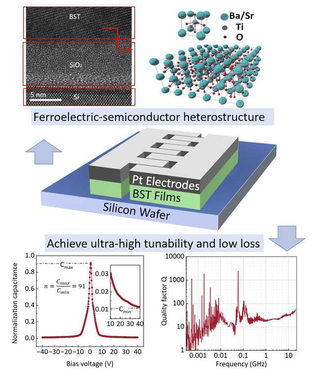 钛酸锶钡(BST)因其高介电常数、低损耗和优异的电压调控特性,被视为下一代射频微波器件的核心材料。然而,传统BST器件在可调性、基底适配性和柔性化方面存在显著瓶颈。近期,KY在线官网张辉教授指导的博士生毛飞龙在《Applied Physics Letters》《Applied Physics Express》等期刊连续发表三项重要研究成果,通过材料设计、工艺优化和器件结构创新,系统性突破BST电容器性能极限和应用领域局限,为高频通信、可穿戴电子等前沿领域提供全新解决方案。