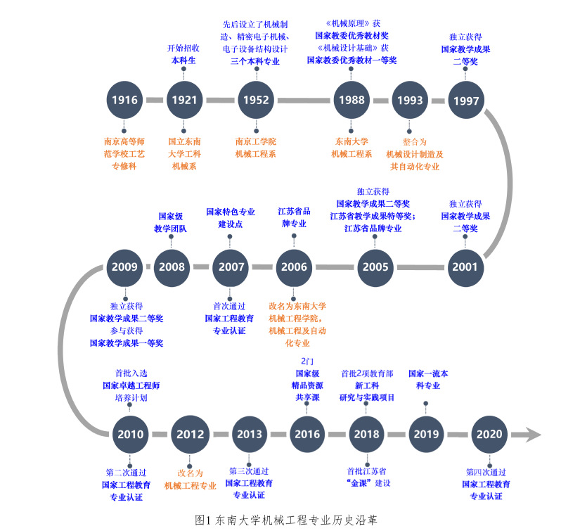 机械工程专业,起源于1916年创办的南京高等师范学校工艺专修科,是东南大学最早设置的工科类专业,1921年开始招收本科生,是国内最早建立的机械系科。1952年院系调整后,原南京工学院机械工程系先后设立了机械制造、精密电子机械、电子设备结构设计等3个本科专业。根据教育部颁布的《普通高等学校本科专业目录》,1993年上述3个本科专业整合为机械设计制造及其自动化专业,2006年改名为机械工程及自动化专业,2012年改名为机械工程专业。该专业2006年入选首批江苏省高等学校品牌专业,2007年入选国家高等学校特色专业建设点,2010年入选首批教育部卓越工程师教育培养计划试点专业,2019年入选首批国家级一流本科专业建设点。2007、2010、2013年和2020年,先后四次通过了国家工程教育专业认证。现拥有机电综合工程训练国家级实验教学示范中心,以及教育部新型光源技术与设备工程研究中心、江苏省微纳生物医疗器械设计与制造重点实验室、江苏省电磁兼容专业测试中心、江苏省空天机械装备工程研究中心、江苏省高档数控机床及成套装备创新中心和江苏省智能电动运载装备工程研究中心6个部省级教研实践中心。